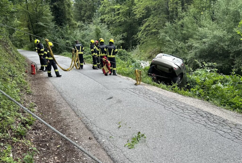 Ein PKW war von der Fahrbahn abgekommen und in Richtung des alten Traunarms abgerutscht. Der Lenker hatte großes Glück: Er konnte sich selbstständig aus dem Fahrzeug befreien und blieb unverletzt.