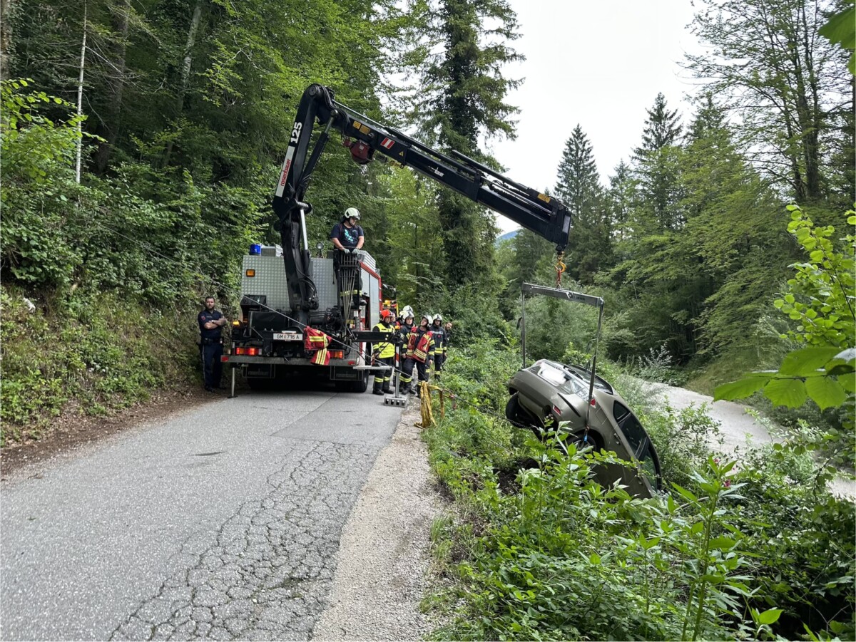 Nach dem Eintreffen der Ischler Kameraden konnte das Unfallfahrzeug mithilfe des Krans behutsam geborgen und wieder auf die Straße zurückgehoben werden. Im Anschluss wurde es an ein Abschleppunternehmen übergeben.
