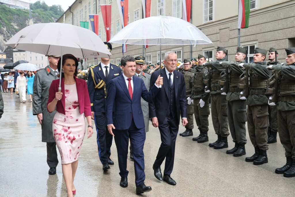 Bundespräsident Alexander Van der Bellen hat vor wenigen Augenblicken das Rumänische Staatsoberhaupt Nicușor Daniel Dan am Residenzplatz empfangen. Gemeinsam mit Landeshauptfrau Karoline Edtstadler schritten sie die Ehrenformation des Bundesheeres ab bevor Festspielpräsidentin Kristina Hammer die vielen Ehrengäste empfing.
