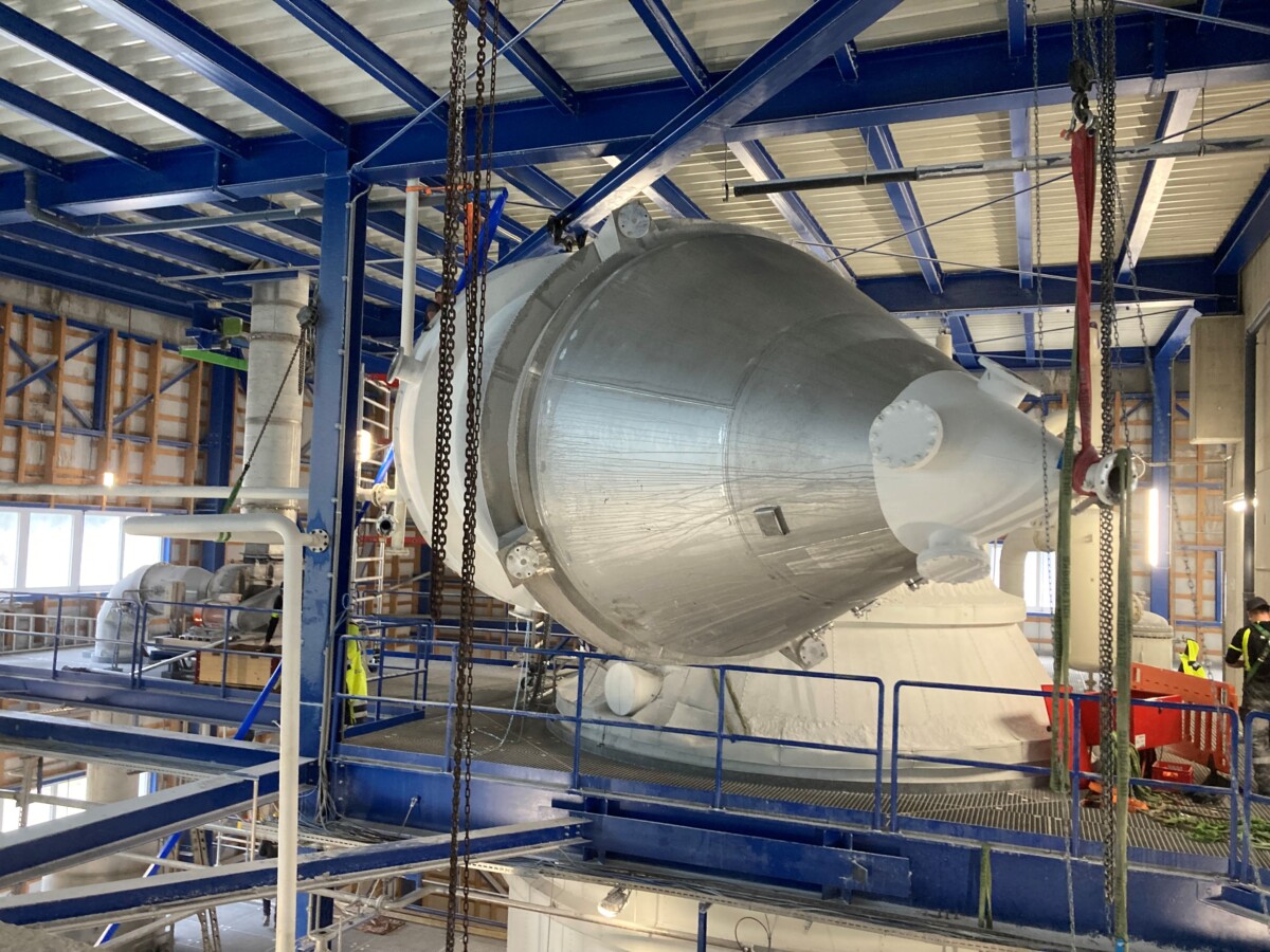 Mit der neuen Prozesstechnik wird der Salzbrei über eine Ringleitung aus den Verdampfern ins Nachbargebäude transportiert, wo er in Vorlagebehältern gesammelt wird. Hier erfolgt im ersten Schritt die Aufbereitung des Salzbreis durch Zentrifugen zu Nasssalz mit einem Feuchtigkeitsgehalt von knapp zwei Prozent, das bereits in Salzlagerhallen gefördert werden kann. Der größte Teil wird jedoch im zweiten Schritt in den Trockneranlagen zu Trockensalz aufbereitet. Jede Trockensalzlinie kann in der Stunde künftig 60 Tonnen Trockensalz produzieren.