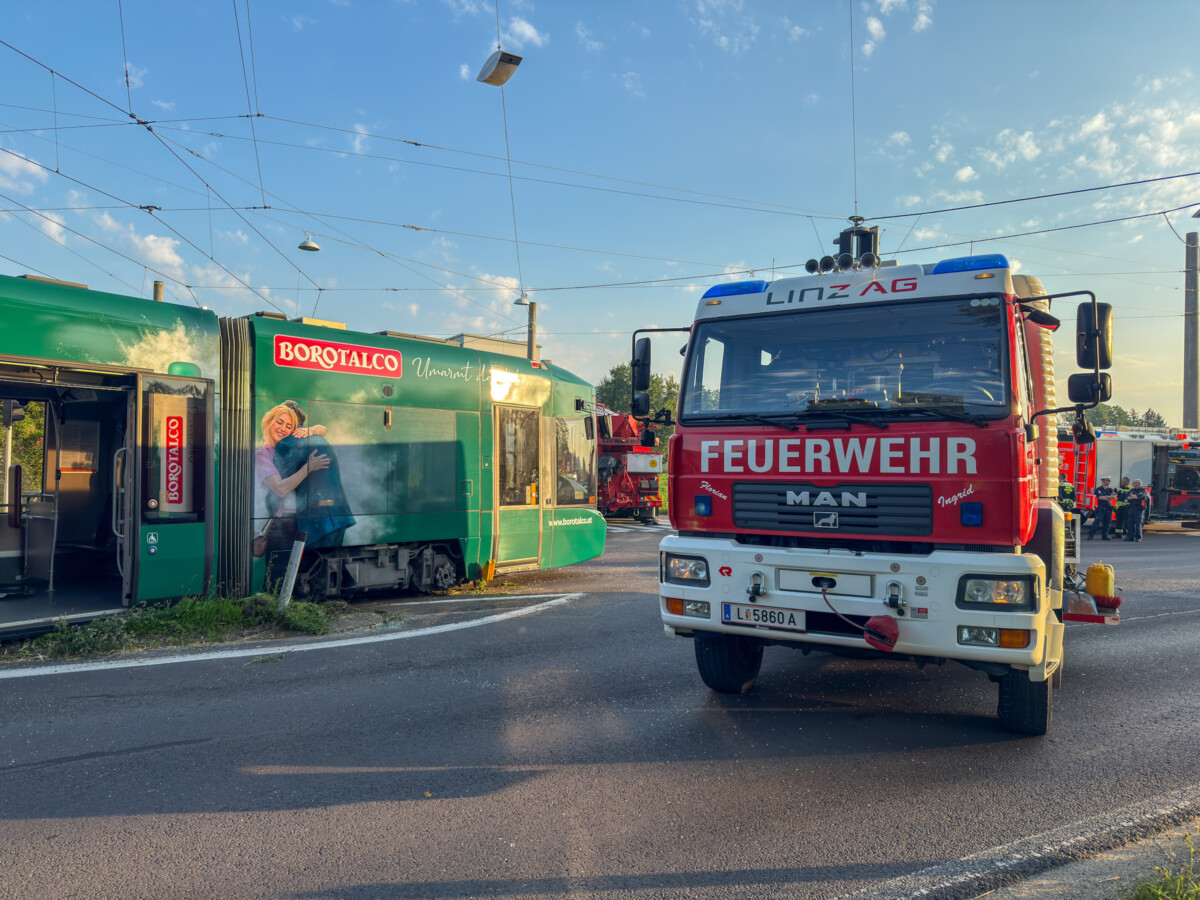 Während der Vorbereitungsarbeiten zur Wiedereingleisung der Straßenbahn setzte sich ein 50-Tonnen-Kraftfahrzeugkran aus bislang ungeklärter Ursache in Bewegung, stürzte eine Böschung hinab und kam in einem angrenzenden Feld seitlich zum Liegen. Zwei Feuerwehrmänner der Berufsfeuerwehr Linz wurden dabei unter dem Fahrzeug eingeklemmt. Der Kranführer konnte sich selbstständig aus dem Führerhaus befreien. Die beiden eingeklemmten Einsatzkräfte wurden von ihren Kameraden binnen kürzester Zeit unter dem Kran herausgerettet.