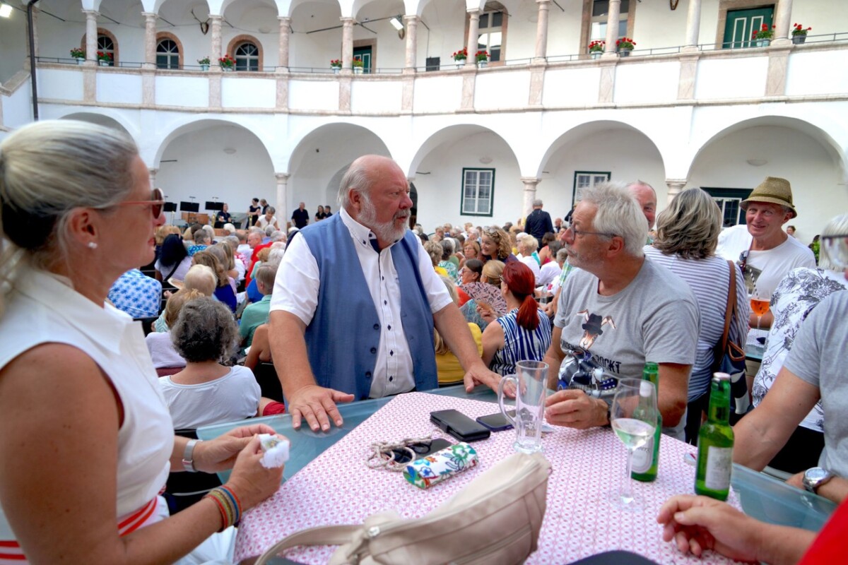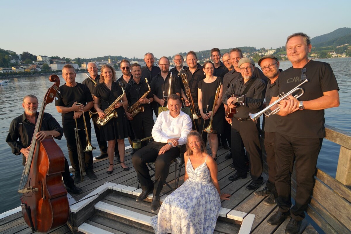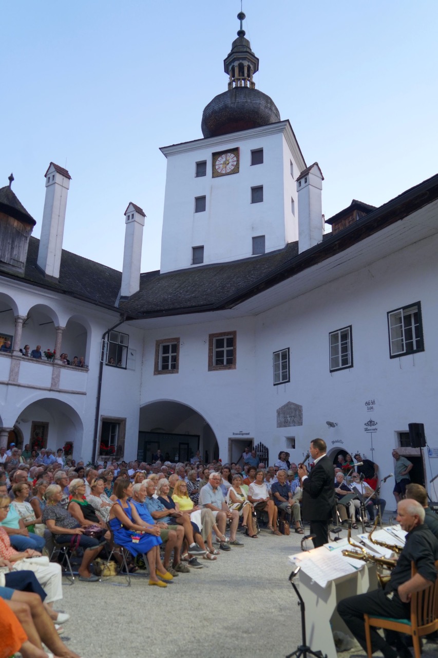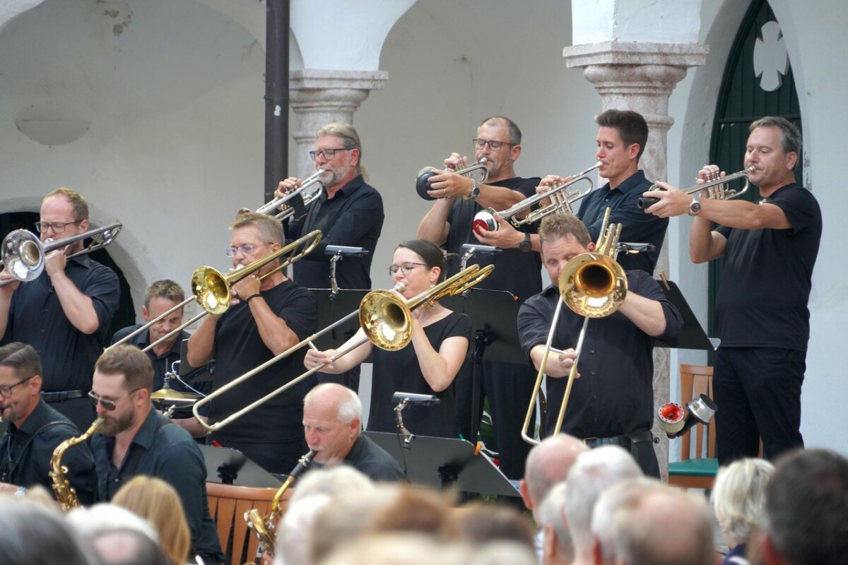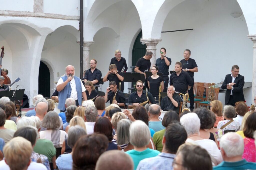„Mehr geht nimmt!”, so die Worte vom Schlosskonzert Veranstalter Konsulent Franz Schindlauer zum Besucheransturm beim Schlosskonzert der FERRY ILG BIG BAND im Seeschloss Ort am Mittwoch 13.8.2025. An die 600 begeisterte Zuschauer/HörerInnen ließen sich dieses Musikerlebnis nicht nehmen. Alle Stühle waren bis auf den letzten Platz belegt, der oben liegende Arkadengang ebenfalls und die Stimmung war hervorragend. Bandleader Wolfgang Fürtbauer war bei seinen Begrüßungsworten ebenfalls sichtlich begeistert und führte seine VollblutmusikerInnen zu Höchstleistungen. Die Big Band wurde 1947 gegründet und die Leitung 1991 von Wolfgang Fürtbauer übernommen und kontinuierlich zur Jazz Band fortgeführt.