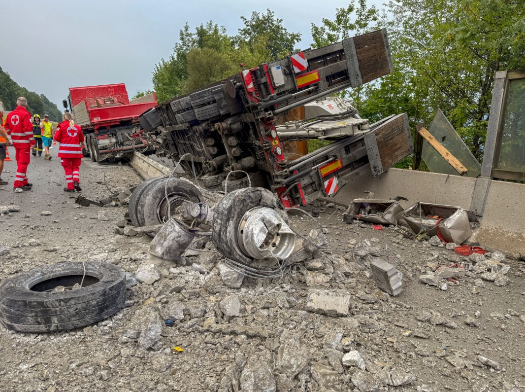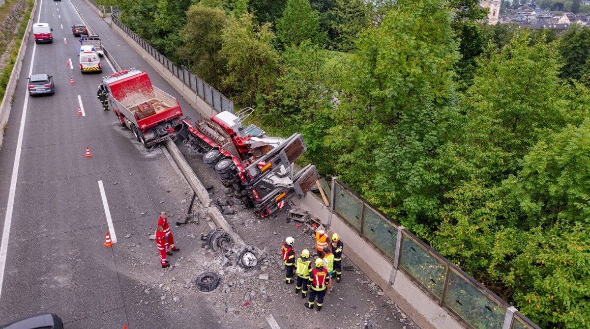 Nachdem der Lenker nicht verletzt war, konnte der Notarzt und das Rotes Kreuz Mondsee wieder abrücken. Der LKW fuhr auf die Betonleitschiene im Baustellenbereich auf und der Anhänger mit Bagger stürzte über die Leitschiene und über Teile der Lärmschutzwand. Um einen Megastau zu verhindern, wurde durch die Feuerwehren und durch die Polizei eine einspurige Durchfahrt ermöglicht.