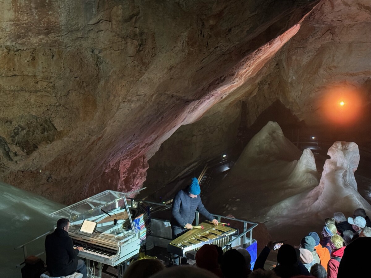 Stimmungen und Gefühle inmitten von Kälte und Klang, von Natur und Kultur von Stille und Musik bestimmten am Freitag den viel bejubelten Auftritt von Tim Collins am Vibraphon und Martin Gasselsberger am Klavier in den Dachstein Eishöhlen. Als Zugabe u.a. “With a Little Help of my Friends von den Beatles. Am Donnerstag, 4.September 2025 gibt es den Abschluss der Eisklang Konzertreihe mit Thomas Gansch, Trompeter von Mnozil Brass und Christian Batanic am Glasflügel mit dem Projekt “Alpenglühen”. Es gibt noch wenige Restkarten unter www.eisklang.at. Letzte Bergfahrt zum Konzert um 16:30 Uhr mit der Dachstein Seilbahn in Obertraun.