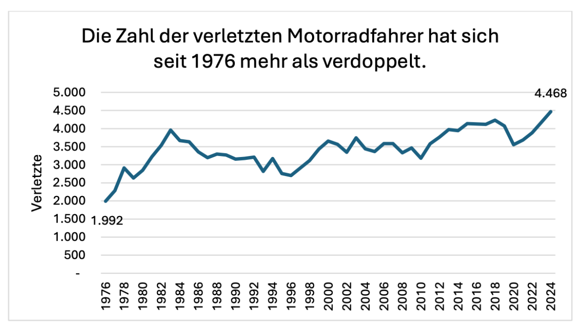 Noch drastischer ist die Entwicklung bei den Verletzten. Bereits im Jahr 2024 erreichte die Anzahl der Verletzten beim Motorradfahren mit 4.468 Personen den höchsten Stand in der österreichischen Motorradgeschichte (s. Grafik im Anhang). Die Anzahl der Getöteten (83) stieg auf den höchsten Wert seit 2018. „Mit Sorge beobachten wir bei dieser Entwicklung auch den Unfallanstieg bei jungen Menschen mit Motorrädern bis 125 cm³“, so Dipl.-Ing. Robatsch.