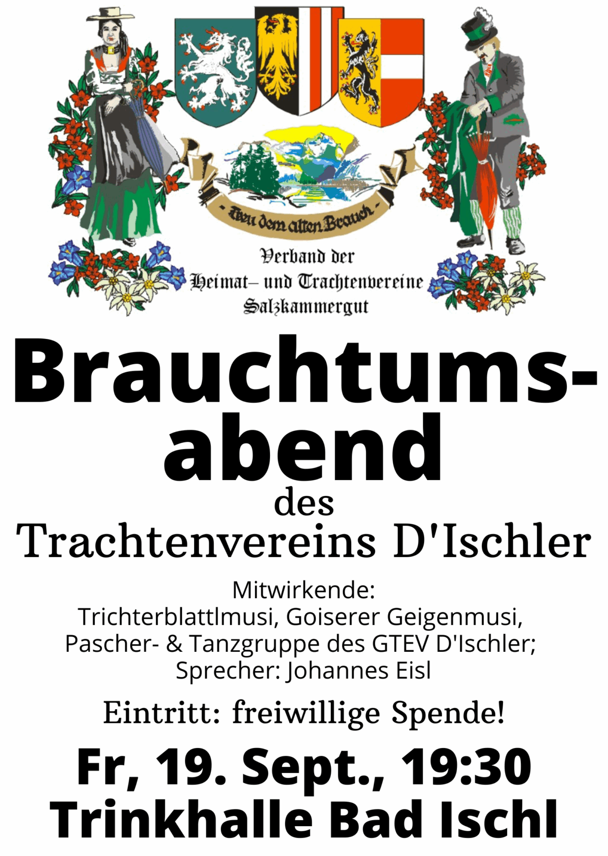Am Freitag, 19. September veranstalten die Ischler Trachtlerinnen und Trachtler ab 19:30 Uhr einen abwechslungsreichen Brauchtumsabend in der Trinkhalle Bad Ischl.