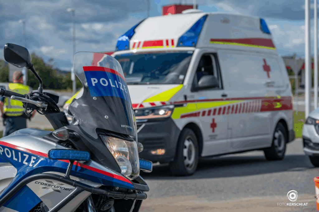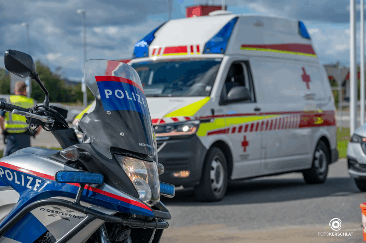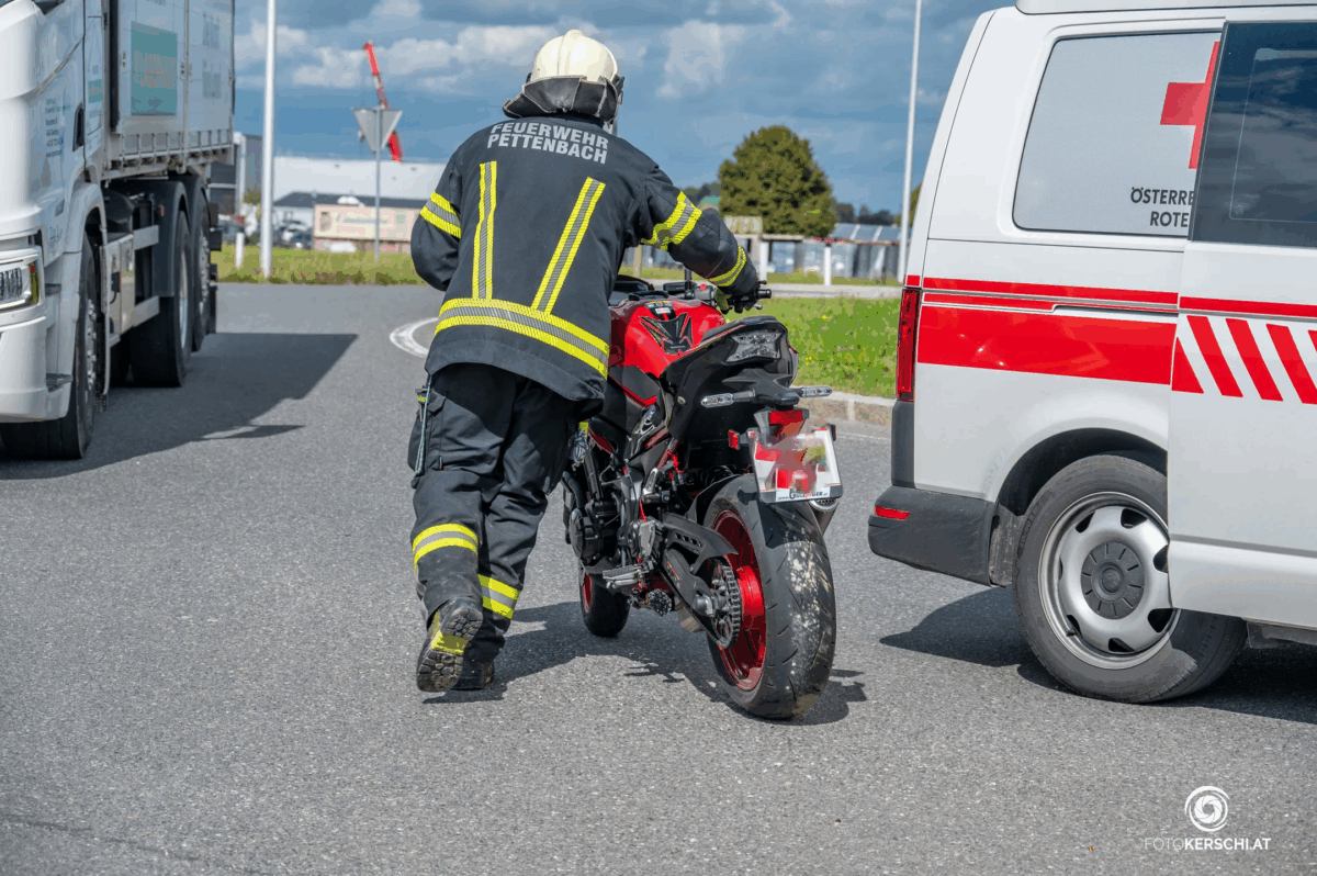 Bezirk Kirchdorf an der Krems, Pettenbach. Polizei, Rotes Kreuz und Feuerwehr wurden am Mittwochmittag zu einem Motorradunfall in einem Kreisverkehr im Gemeindegebiet von Pettenbach alarmiert, ein Motorradlenker ist aus bislang unbekannter Ursache im Kreisverkehr zu sturz gekommen.