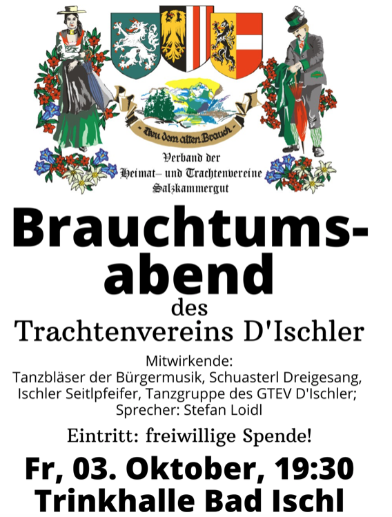 Die Ischler Trachtlerinnen und Trachtler laden am Fr, 3.10. um 19:30 zum letzten Brauchtumsabend in diesem Jahr in die Trinkhalle ein.