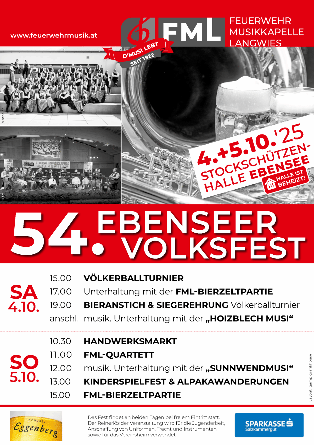 Die Feuerwehrmusikkapelle Langwies lädt am 04. & 05. Oktober 2025 sehr herzlich zum bereits 54. Ebenseer Volksfest in die beheizte Stockschützenhalle Ebensee ein.