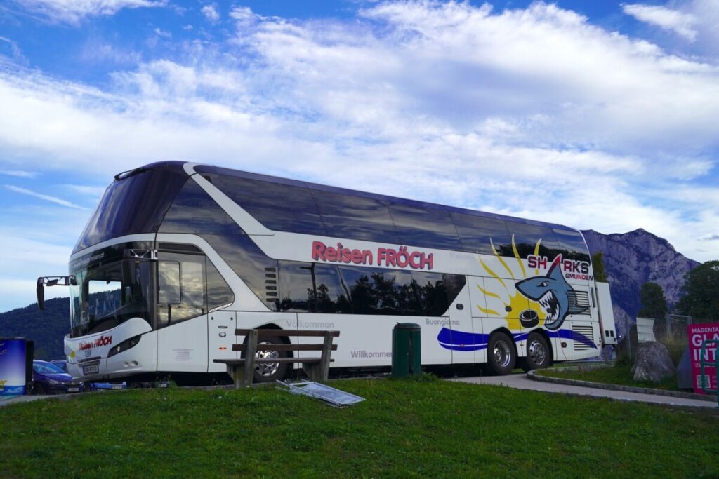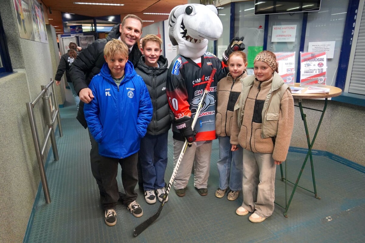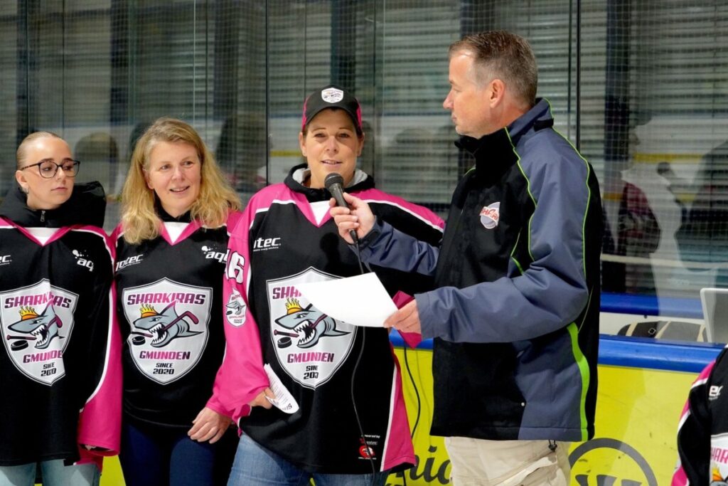 Vor der MUKI Eisarena wartete für die Fans die erste Überraschung. Der neue Mannschaftsbus der CAM4Dent Sharks von Busreisen FRÖCH Laakirchen, ein wohlgesonnener Sponsor der Haie, stand zur Besichtigung vor dem Haifischbecken und rief Staunen hervor. Busreisen Fröch war auch heute zugleich der Spielsponsor. Der Spielpuck wurde durch Helmut Keckeis, eine Eishockeyikone und gut Bekannter des Eishockeyvereines Gmunden mit Obmann Günter Kail eingeworfen. An die 300 Eishockeyfans waren in die Eishalle gekommen und unterstützten lautstark ihre Sharks und sie bekamen ein Eishockeyspiel der Sonderklasse, dass an Spannung nicht zu überbieten war präsentiert. In der ersten Drittelpause wurden die „Shakiras” die Gmundner Eishockey Damenmannschaft unter Leitung von Daniela Zsitek vorgestellt und in der zweiten Pause dann das bereits beliebte Puckwerfen mit tollen Preisen veranstaltet.