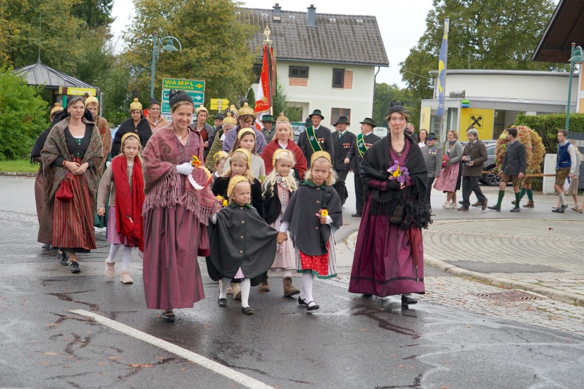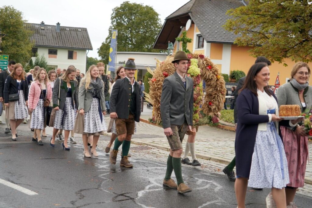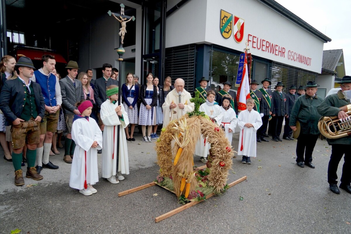 Mit dem Erntedankfest wurde heute Sonntag 5.10.2025 in der Pfarre Gschwandt für die gute Ernte des Jahres 2025 DANKESCHÖN gesagt. Dazu trafen sich um 8:45 Uhr eine große große Teilnehmerzahl an Gemeindebürgerinnen und Bürger, der Kindergarten Gschwandt, die Musikkapelle Gschwandt, der Kamaradschaftsbund mit Obmann Franz Wampl, die Goldhauben-, Kopftuch-, und Hutgruppe Gschwandt mit Obfrau Barbara Reiter, der Pfarrgemeinderat, die Landjugend Gschwandt mit der wunderschön hergestellten Erntekrone und Pfarrer Alois Kainberger mit Ministranten. Dann bewegte sich der Festzug vom Feuerwehrdebot in Richtung Pfarrkirche, um dort die heilige Messe zum Erntedank zu feiern. Die Erntekrone wurde von den Burschen der Landjugend in die Kirche getragen und vor dem Altar aufgestellt.
