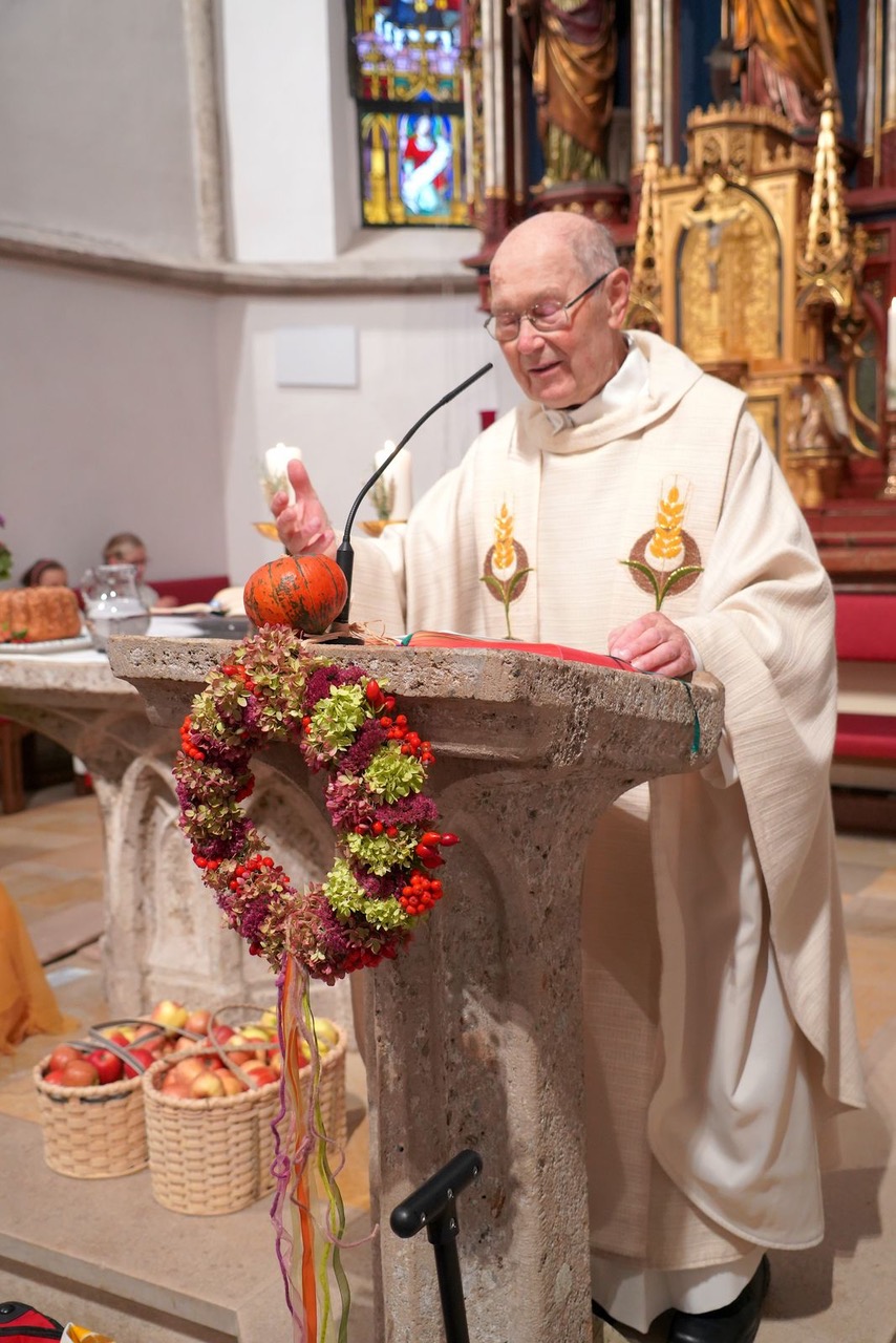 Die Kindergartengruppe mit Betreuerinnen und Eltern begaben sich zwischenzeitlich in den Gymnastiksaal der Volksschule, um dort das Erntedankfest auf ihre Weise z feiern und kamen zum gemeinsamen Vaterunser wieder in die Kirche zurück. „Es war ein sehr gutes Erntejahr ohne gröbere Ausfälle und dafür danken wir unseren Hergott von ganzem Herzen”, so die Worte von Pfarrer Alois Kainberger. Nach Ende der Messfeier gab es im im Eingangsbereich der Volksschule eine Agape von den Bäuerinnen Gschwandt, zu der herzlich eingeladen war.