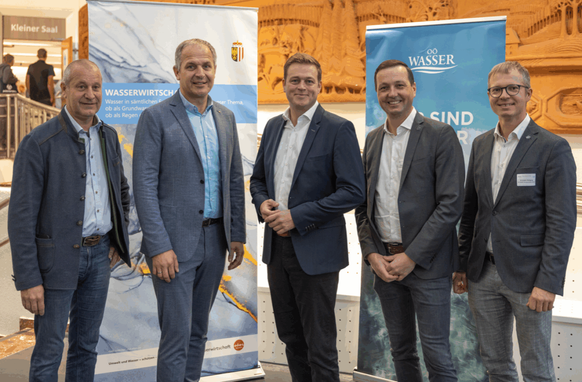 v.l.: Manfred Altendorfer (Obmann OÖ Wasser), LAbg. Bgm. Christian Mader (Präsident OÖ Gemeindebund), Umwelt- und Klima-Landesrat Stefan Kaineder, DI Florian Maringer (Geschäftsführer OÖ Wasser) und DI Wolfgang Kröpfel (stv. Geschäftsführer OÖ Wasser)