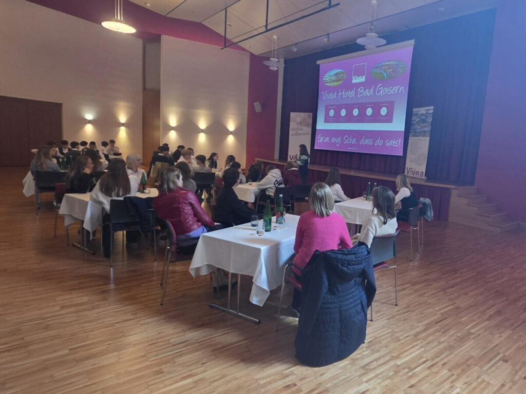 Die erste Gruppe startete ihren Tag im Vivea Gesundheitshotel Bad Goisern, wo die Schüler/innen einen Blick hinter die Kulissen werfen durften. Von der Rezeption über den Spa-Bereich lernten sie die vielfältigen Aufgabenfelder eines modernen Gesundheitshotels kennen. Bei einer ausführlichen Führung durch das Haus wurde schnell klar, wie viele Menschen und Berufe dazu beitragen, Gästen einen erholsamen Aufenthalt zu bieten.