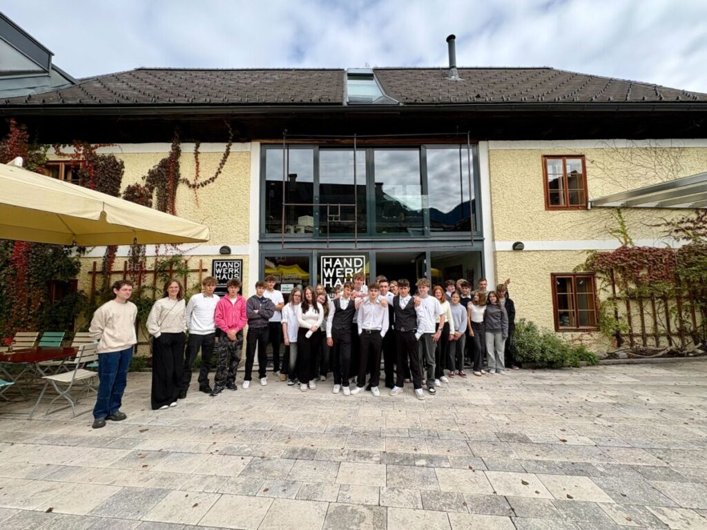 Anschließend ging es weiter ins Hand.Werk.Haus Salzkammergut, wo die Schüler/innen von Barbara Kern begrüßt wurden. Sie führte die Gruppe durch die aktuelle Sonderausstellung „Was Hände können – Handwerk macht Schule“ – eine Initiative, die zeigt, wie traditionelles Handwerk, Kreativität und Ausbildung ineinandergreifen. Besonders begeistert waren die Jugendlichen vom abschließenden Workshop mit Michael Körner, bei dem sie selbst aktiv wurden: Gemeinsam gestalteten sie Mäppchen für Speisekarten, die künftig im Servierunterricht Verwendung finden.