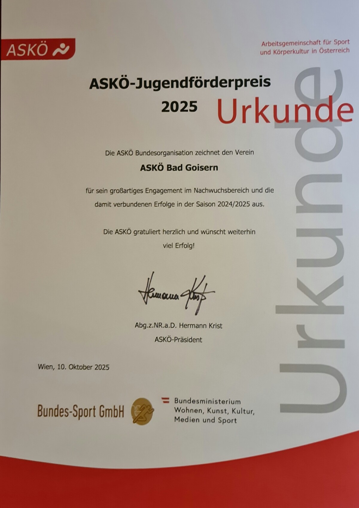 Am 10. Oktober 2025 zeichnete die ASKÖ-Bundesorganisation im Haus des Sports im Spiegelsaal in Wien Sportvereine sowie Trainerinnen und Trainer für ihr großartiges Engagement aus. Von jedem Bundesland wurden drei Vereine (Plätze 1 – 3) mit dem ASKÖ-Jugendförderpreis ausgezeichnet, Trainer wurden sechs geehrt.
