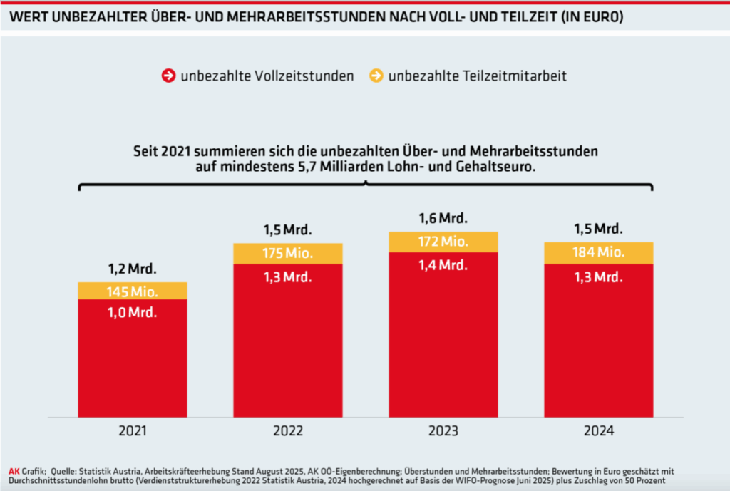 5,7 Milliarden Euro für Überstunden und Mehrarbeit seit 2021 unbezahlt: AK fordert Gegenmaßnahmen