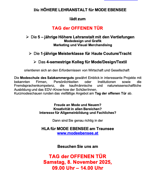Ein Tages der offenen Tür der HLA für Mode Ebensee am Traunsee findet am 8. Nov. 2025 von 09.00 – 14.00 Uhr statt.