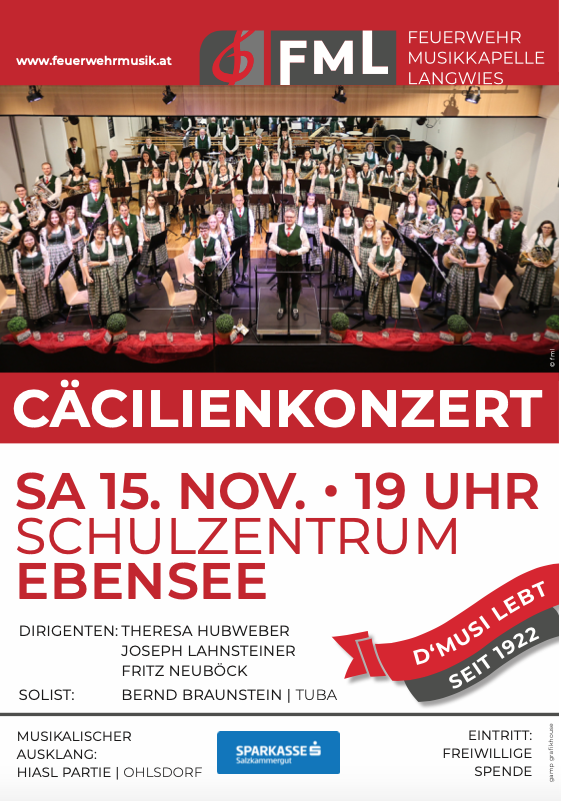 Am Samstag, den 15. November 2025, um 19:00 Uhr, konzertieren die Musikerinnen und Musiker im Festsaal des Schulzentrums Ebensee unter der musikalischen Leitung von Theresa Hubweber, Joseph Lahnsteiner und Fritz Neuböck.