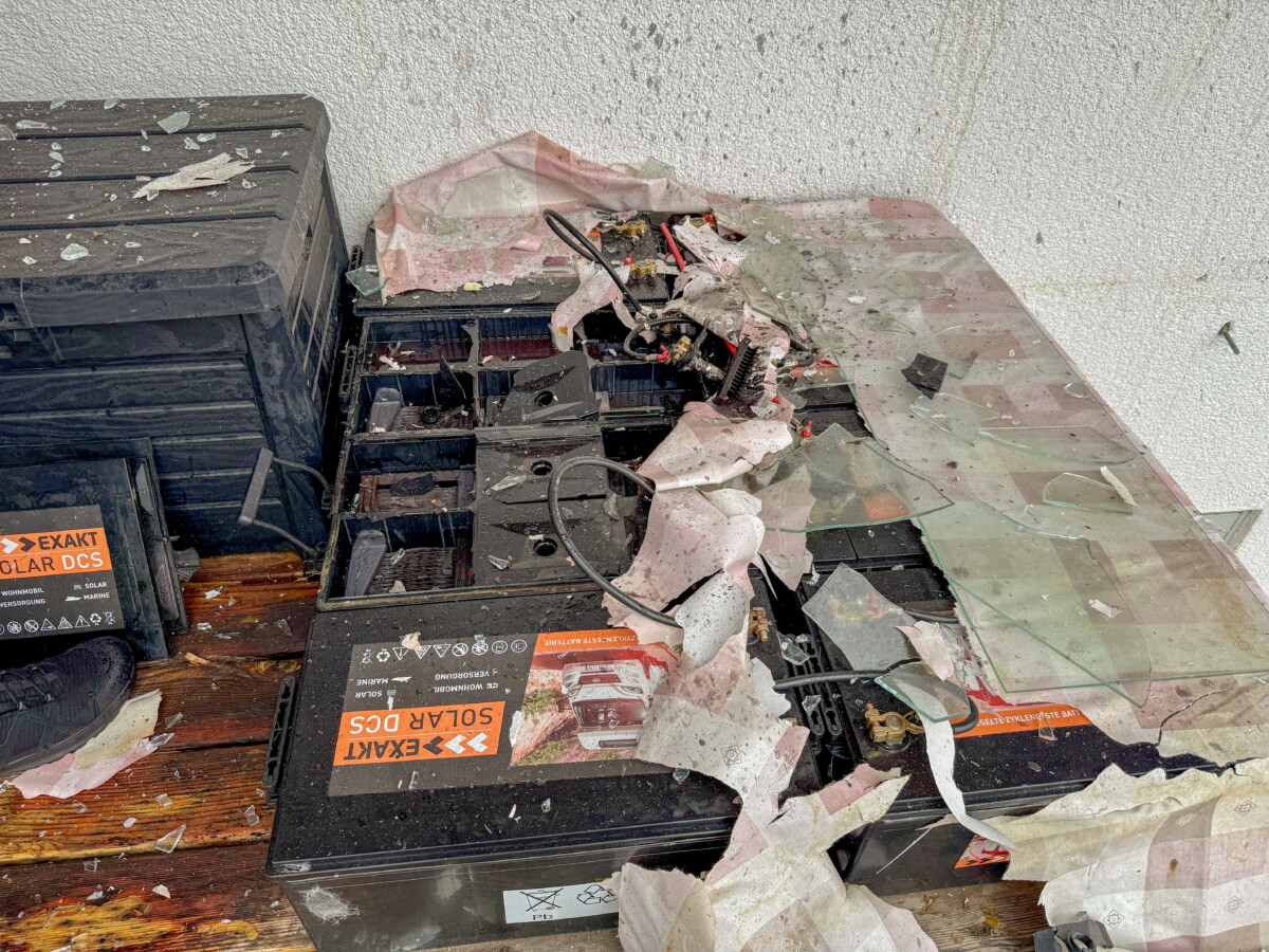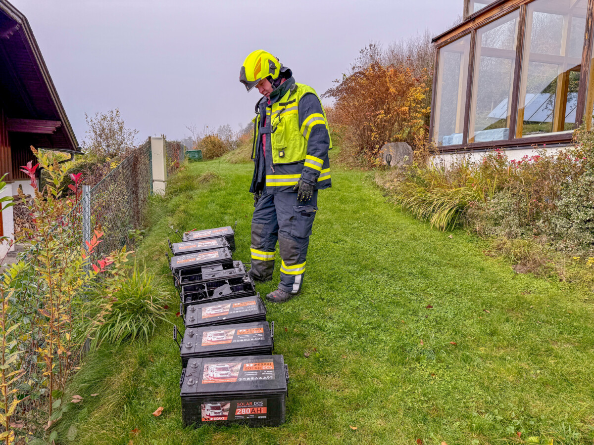 Einsatzleiter Walter Höllermann war mit dem Kommandofahrzeug als erster vor Ort: „Beim Eintreffen waren keine Flammen und keine Rauchentwicklung feststellbar, einige Akkumodule eines PV-Speichers auf der Terrasse waren explodiert!”
