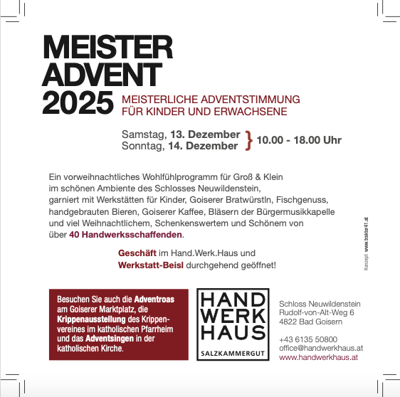 Beim Meisteradvent im Hand.Werk.Haus geht es um die Vielfalt von Handwerk und Handgemachtem und so sind über 40 Handwerksschaffende am 13. und 14. Dezember von 10-18 Uhr in Bad Goisern vor Ort. Ein vorweihnachtliches Wohlfühlprogramm für Groß & Klein im schönen Ambiente des Schlosses Neuwildenstein, garniert mit Goiserer Bratwürstl‘n, Fischgenus, handgebrauten Bieren vom Attersee, in Goisern gerösteten Kaffee, …