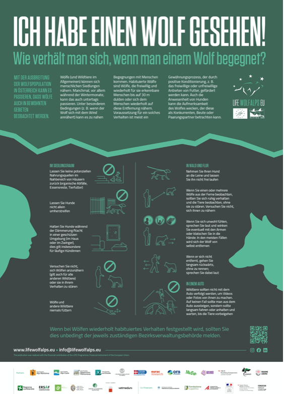 Das Poster “Ich habe einen Wolf gesehen!” (r.) liefert eine Übersicht über das richtige Verhalten in Regionen mit Wolfspräsenz. Es wurde von Expert*innen im Rahmen des Projektes LIFE WolfAlps EU erstellt.