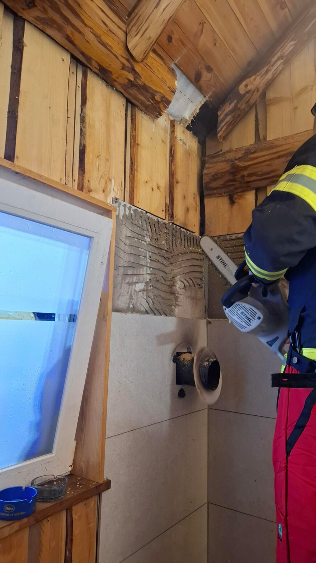 Vor Ort stellte sich der Verdacht schnell als berechtigt heraus: Aus der Eingangstür sowie der Dachentlüftung eines Nebengebäudes drang bereits Rauch. Im Bereich des Aufenthaltsraumes und des Dachstuhls hatte sich ein Schwelbrand entwickelt, der auf Teile der Holzkonstruktion übergriff.