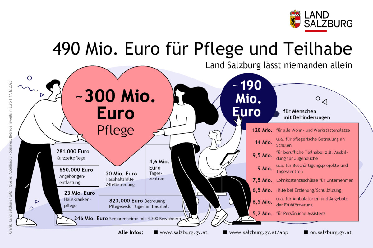 Der größte Brocken im Sozialbudget des Landes entfällt auf die Bereiche Pflege und Betreuung. Insgesamt hat das Land Salzburg hier 487 Millionen Euro an Gesamtaufwendungen, davon betreffen 188 Millionen Euro die Teilhabe für die Betreuung von Menschen mit Behinderung und 298,6 Millionen Euro für die Pflege und Betreuung von Seniorinnen und Senioren. Aber wohin fließt das Geld im Detail und wofür wird es aufgewendet? Der Landesvoranschlag 2026 zeigt hierzu Details im Sozialbudget.