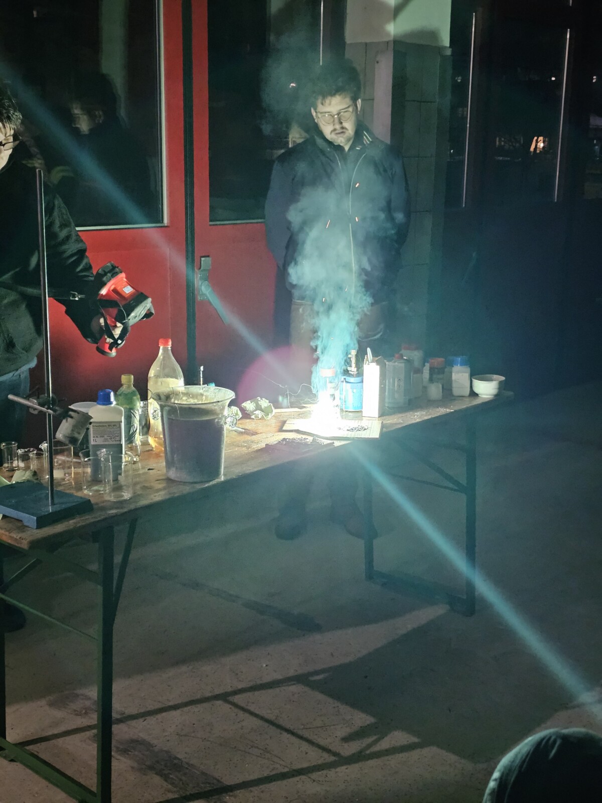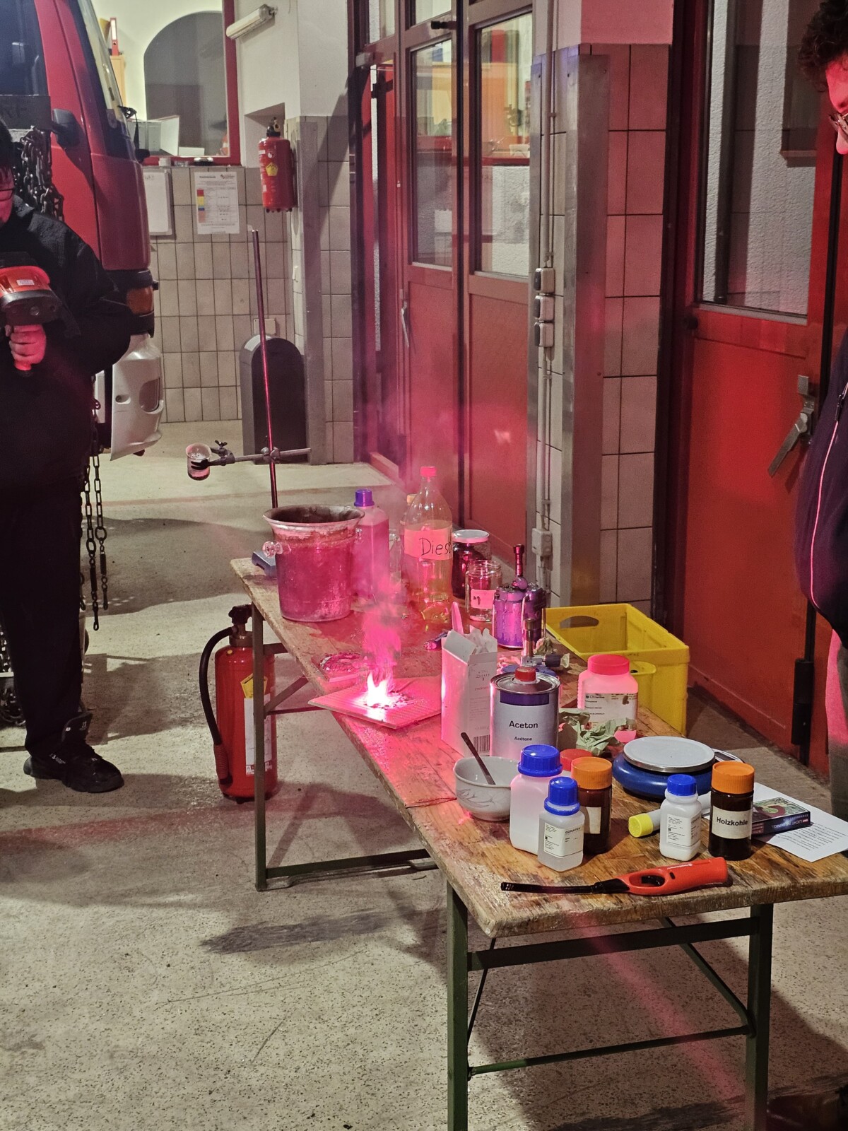Nach dem Theorieteil wurde die Fahrzeughalle kurzerhand zum Chemiesaal umfunktioniert.
