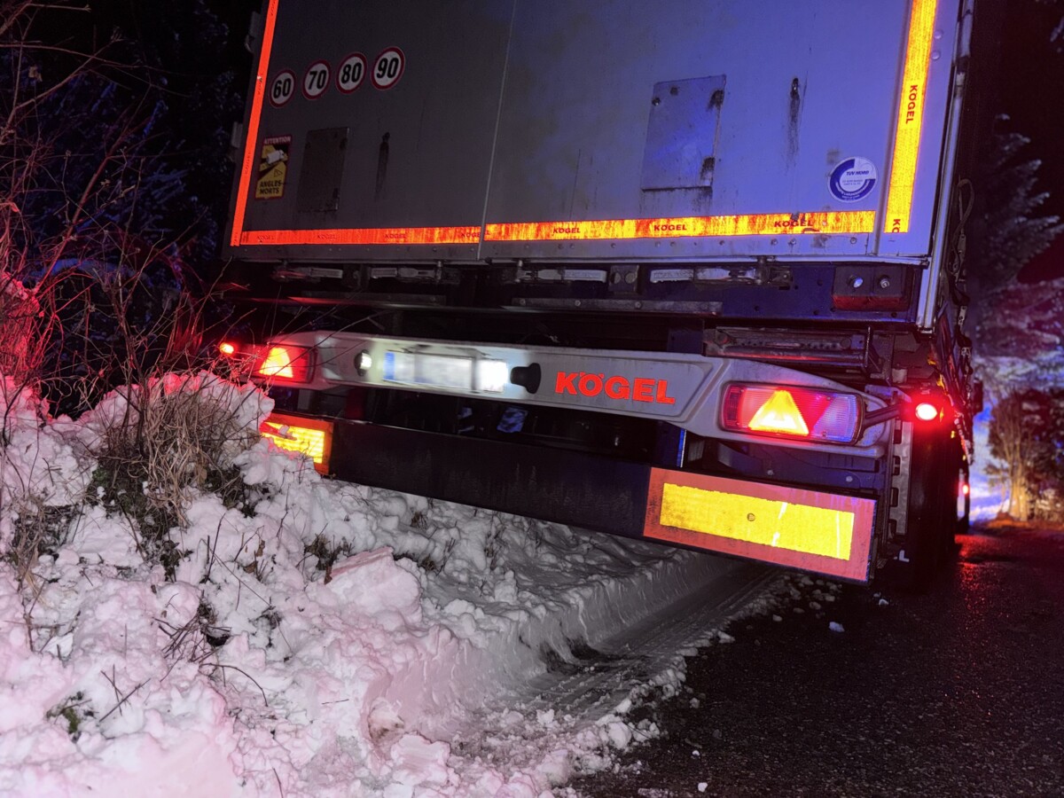 Der Lenker bugsierte den Hängerzug beim Versuch wieder retour zu schieben über das Bankett wo er in weiterer Folge hängen blieb und kein Weiterkommen mehr möglich war.