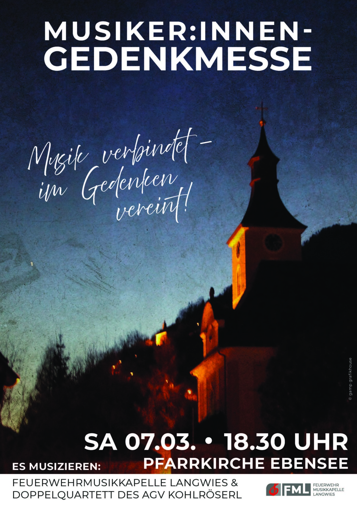 Am Samstag, 7. März 2026 findet um 18:30 Uhr in der Pfarrkirche Ebensee die erste Musiker:innen Gedenkmesse statt.