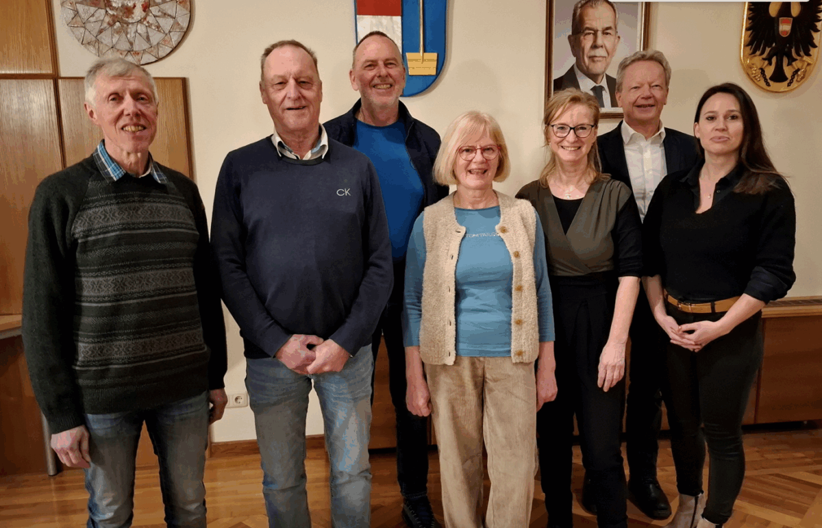 v.l. Rudolf Scheutz, Alfred Gamsjäger, Rudolf Prohaska, Heike Scheutz, Obfrau Roswitha Seethaler, Bgm Alexander Scheutz, Nina Stöckl-Heininger – Foto©Franz Frühauf