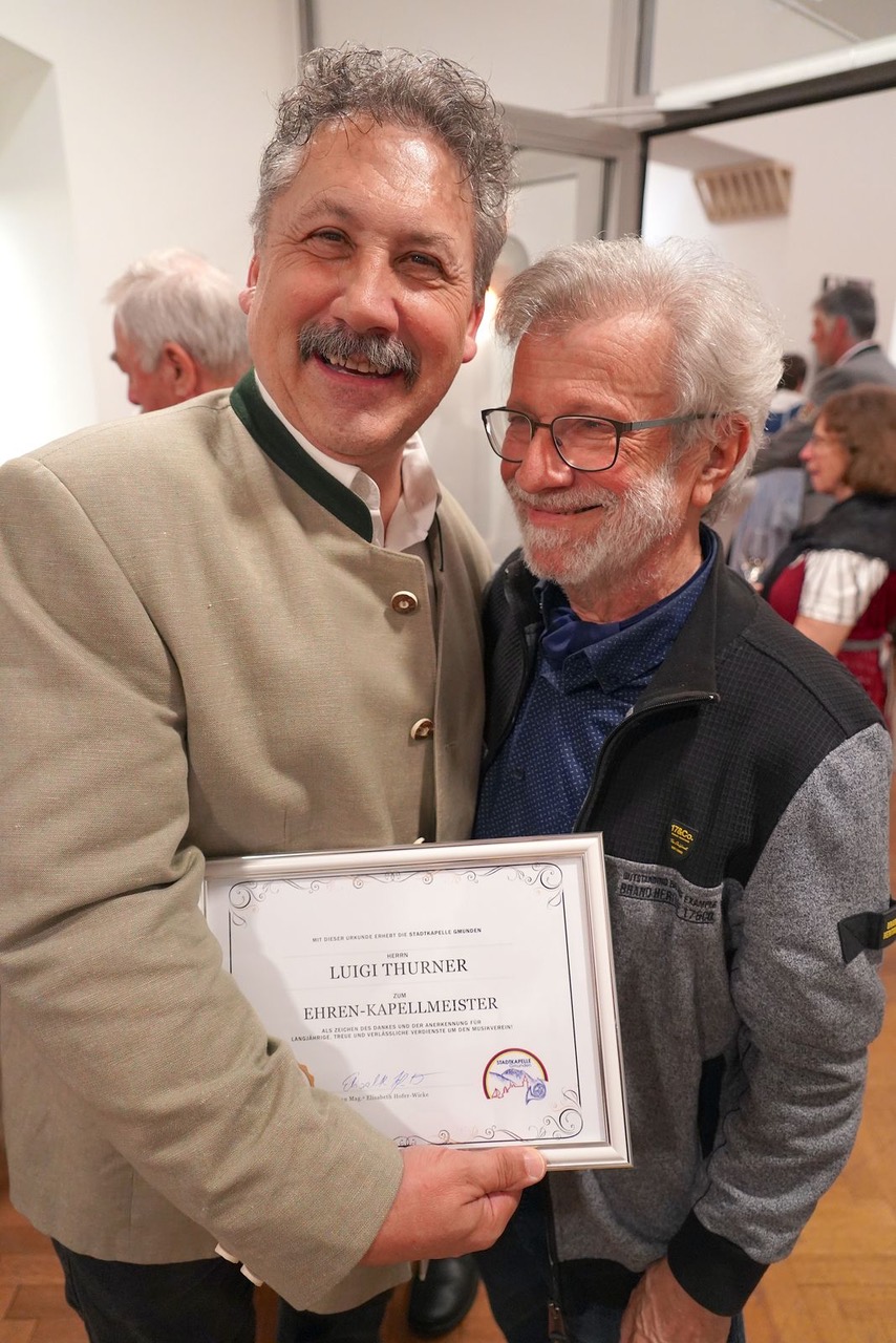 Was dann kam übertraf sämtliche Erwartungen. Von „The Thone Room“ über „Die Fledermaus“, eine Südböhmische Polka, „Avatar: The Way of Water“, der „Hymne a’ la Musique bis zum Hessenmarsch wurden die begeisterten Zuhörer,- und Seher mit musikalischen Leckerbissen verwöhnt. Zwischenzeitlich wurde Luigi Thurner, eh. Kapellmeister der Stadtkapelle Gmunden für seine langjährigen Dienste eine Urkunde zum Ehrenkapellmeister überreicht. Dann ging es in die wohlverdiente Pause, wo es im ersten Stock feste und flüssige Nahrung für ALLE gab. Dort konnte man auch die tollen selbstgefertigten Taschen aus den alten Uniformen der Stadtkapelle erwerben und so ein kleiner Sponsor der Stadtkapelle werden, falls man es nicht eh schon war.