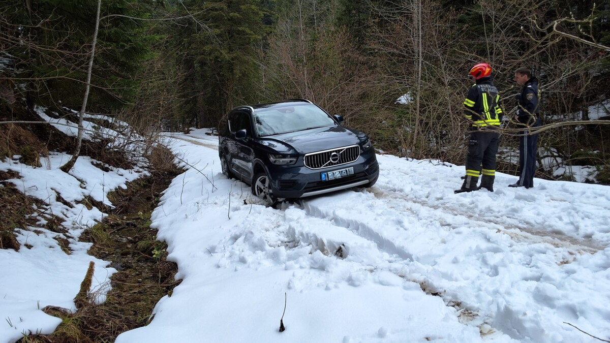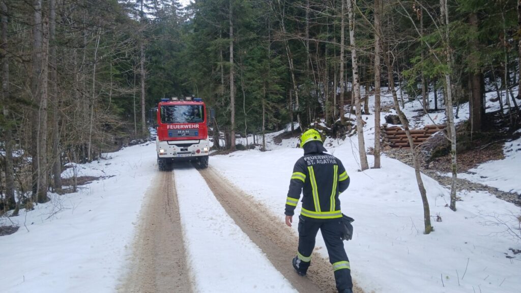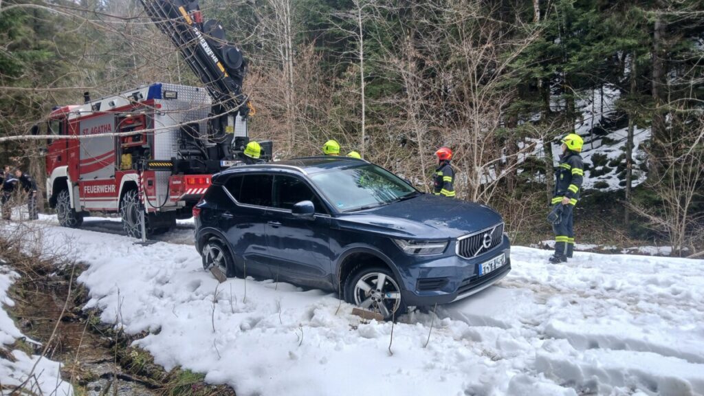 Am 03.04.2026 wurde die Freiwillige Feuerwehr St. Agatha zum zweiten Mal in dieser Woche zu einer Fahrzeugbergung auf der Forststraße im Leisling alarmiert. An nahezu derselben Stelle wie bereits wenige Tage zuvor rutschte ein Personenkraftwagen auf der schneebedeckten Fahrbahn in den angrenzenden Straßengraben und konnte seine Fahrt nicht mehr fortsetzen.