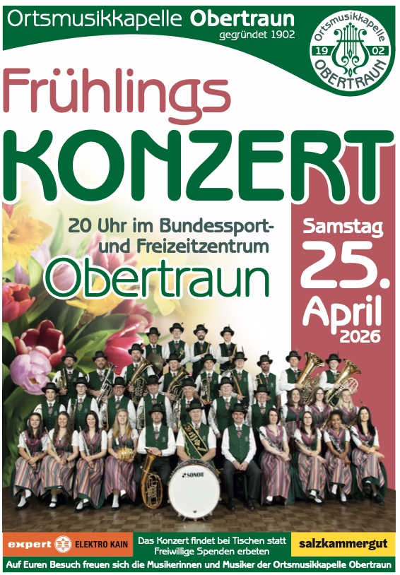 Am Samstag, dem 25. April 2026, lädt die Ortsmusikkapelle Obertraun zu ihrem bereits traditionellen Frühlingskonzert ein. Beginn ist um 20 Uhr im Bundessport- und Freizeitzentrum Obertraun.