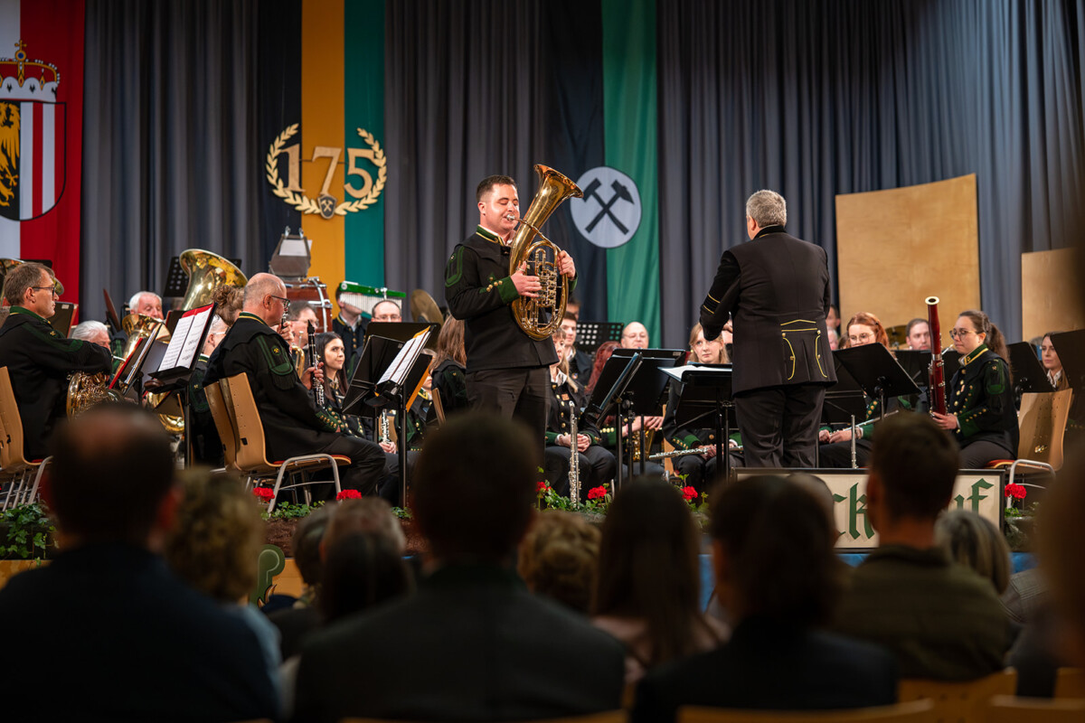 Den zweiten Konzertteil eröffnete das Werk „La Storia“ von Jacob de Haan. Im Anschluss rückte ein junger Musiker ins Rampenlicht: Philipp Berger, derzeit Mitglied der Militärmusik Steiermark, überzeugte mit dem Solostück „Carrickfergus“ auf dem Euphonium. Mit dem „Aladdin Medley“ sowie der Polka „Grenzenlos“ fand der festliche Abend einen stimmungsvollen Ausklang.